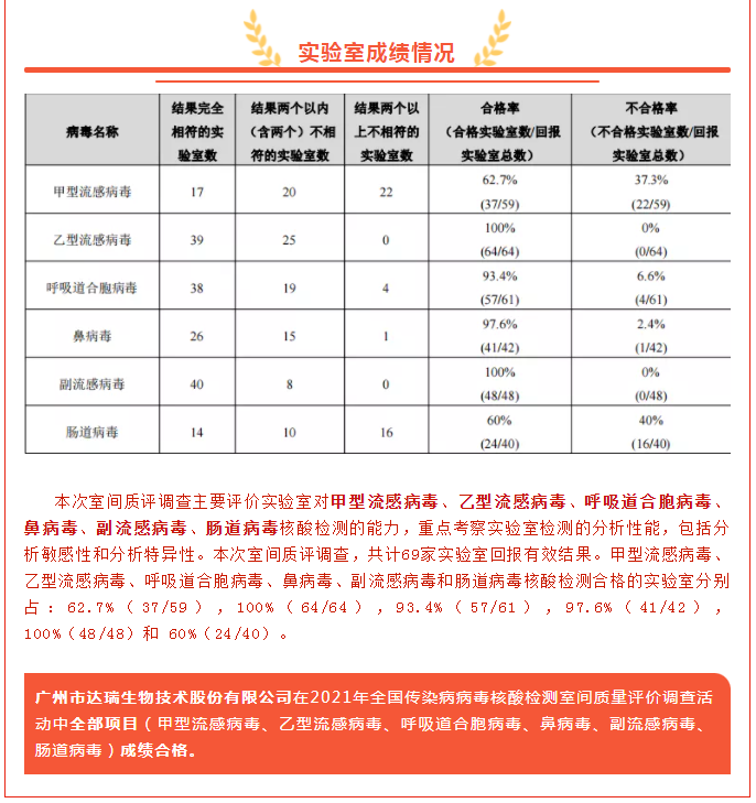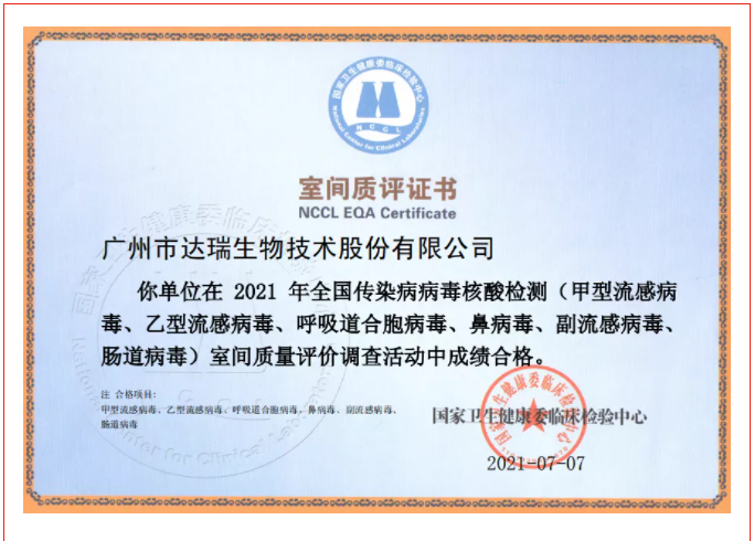 喜訊|廣州市達(dá)瑞生物技術(shù)股份有限公司在2021年全國(guó)傳染病病毒核酸檢測(cè)室間質(zhì)量評(píng)價(jià)調(diào)查活動(dòng)中全部項(xiàng)目成績(jī)合格